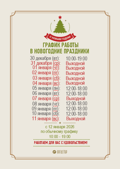 График работы офиса компании "Пегас-Тур" в Новогодние праздники.