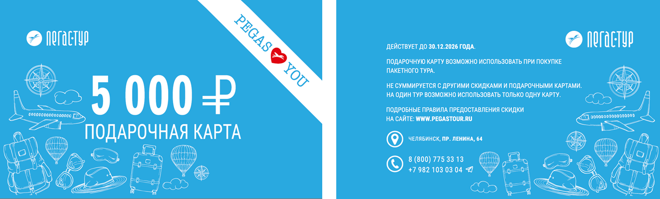 Подарочная карта на 5000 рублей действует до 30.12.2026 года. Подарочную карту возможно использовать при покупке пакетного тура. Не суммируется с другими скидками и подарочными картами. На один тур возможно использовать только одну карту.